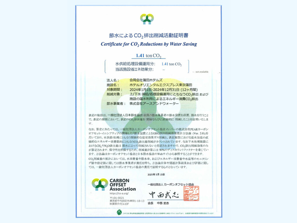 ホテル オリエンタル エクスプレス 東京蒲田は、昨年導入した客室節水装置による節水活動が、一般社団法人カーボンオフセット協会に認められ、節水によるCO2排出削減活動証明書の交付を受けました。   …